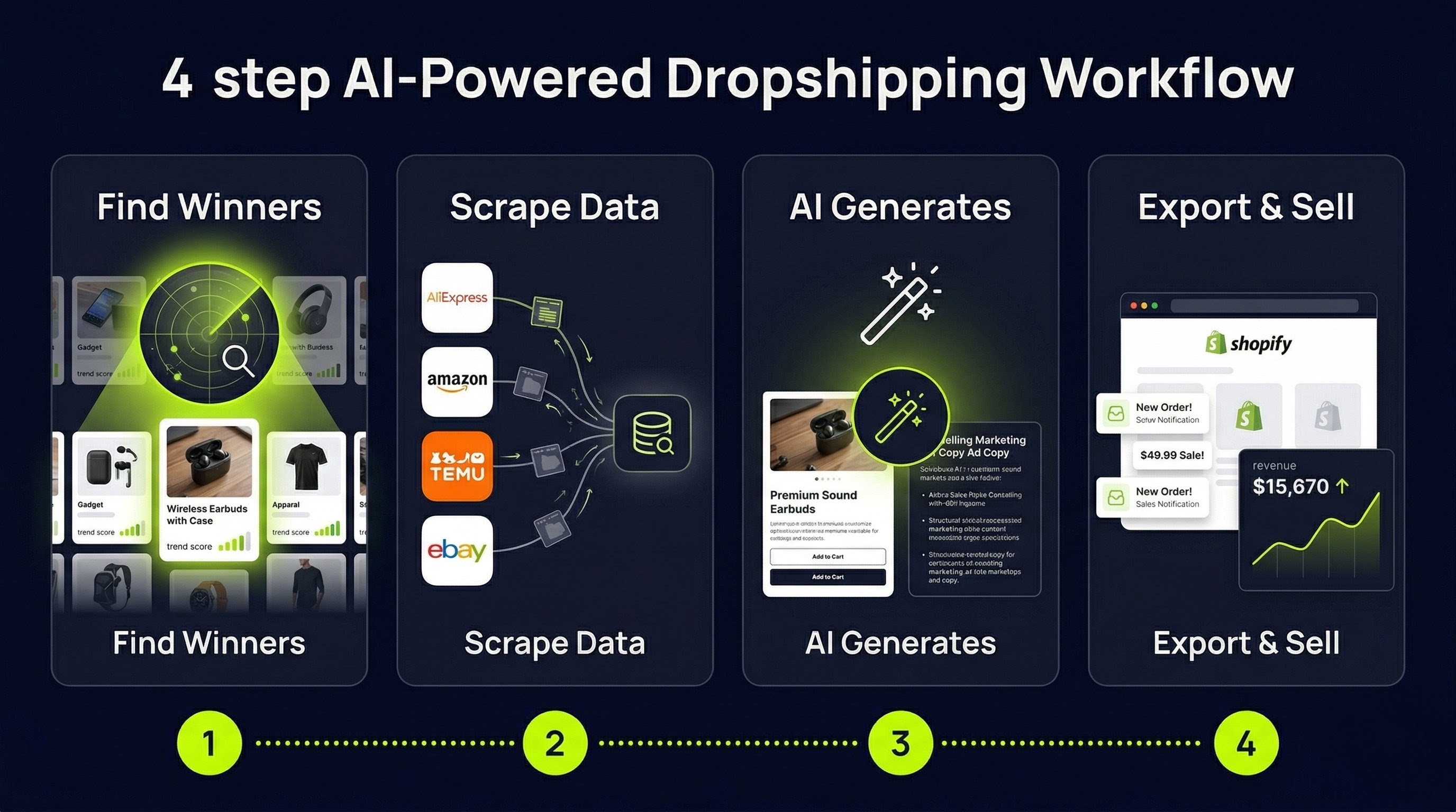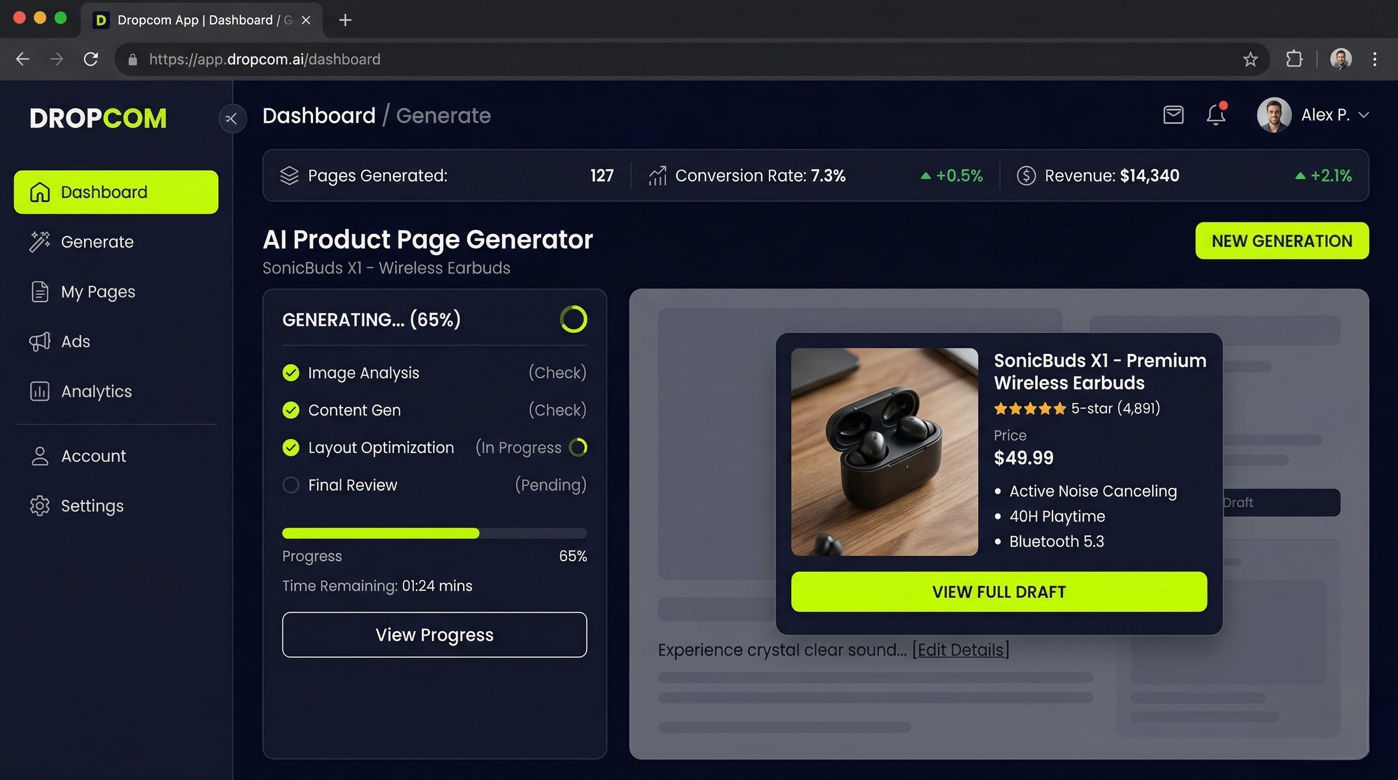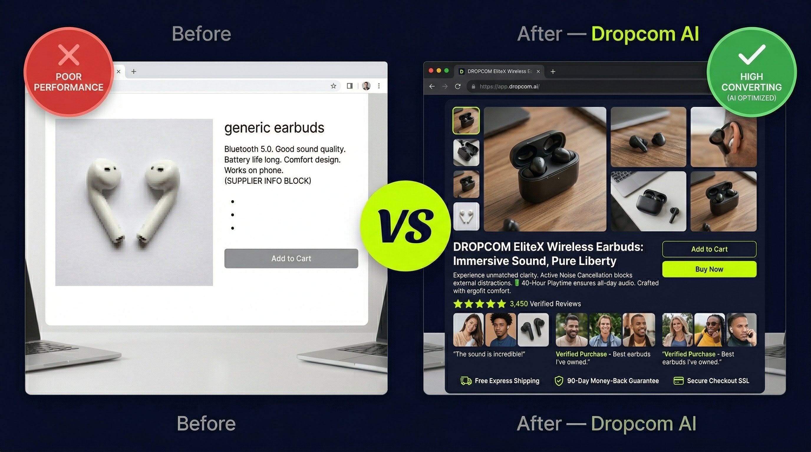 Dites adieu aux copywriters coûteux et aux designers. L'IA de Dropcom crée des pages produit parfaites instantanément, vous laissant vous concentrer sur la croissance de votre boutique.